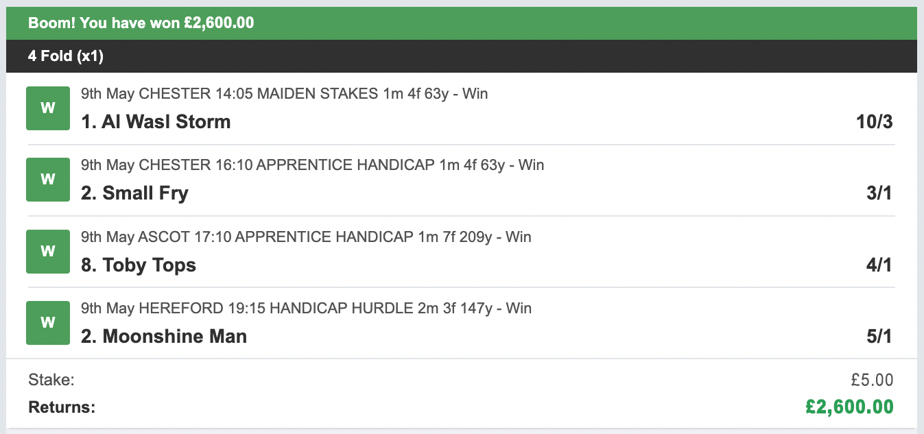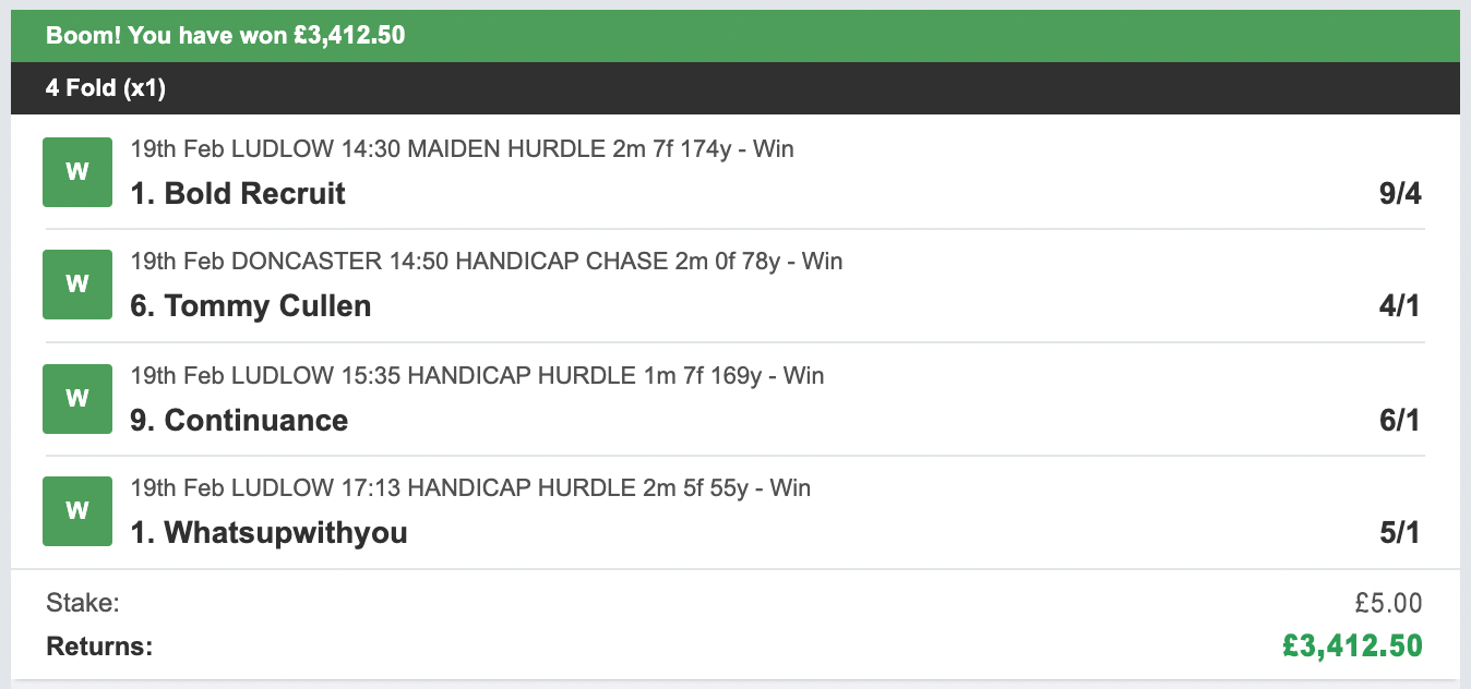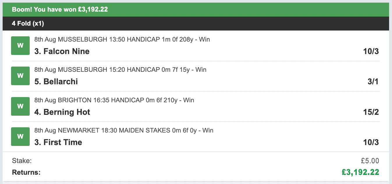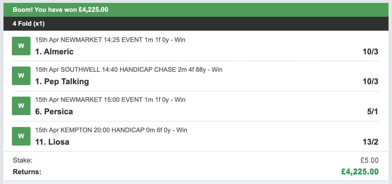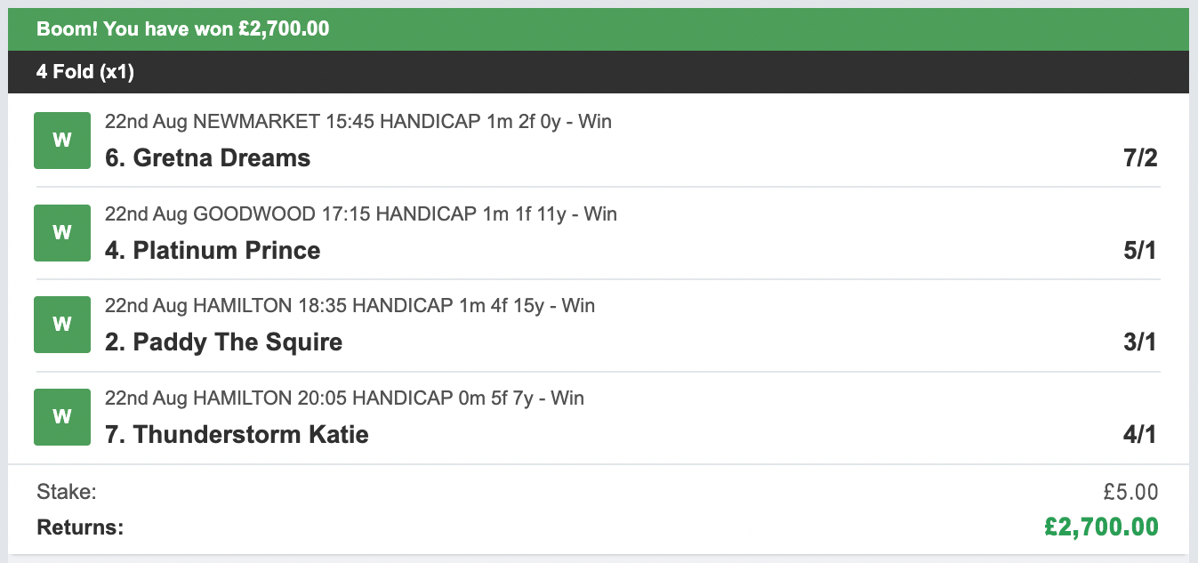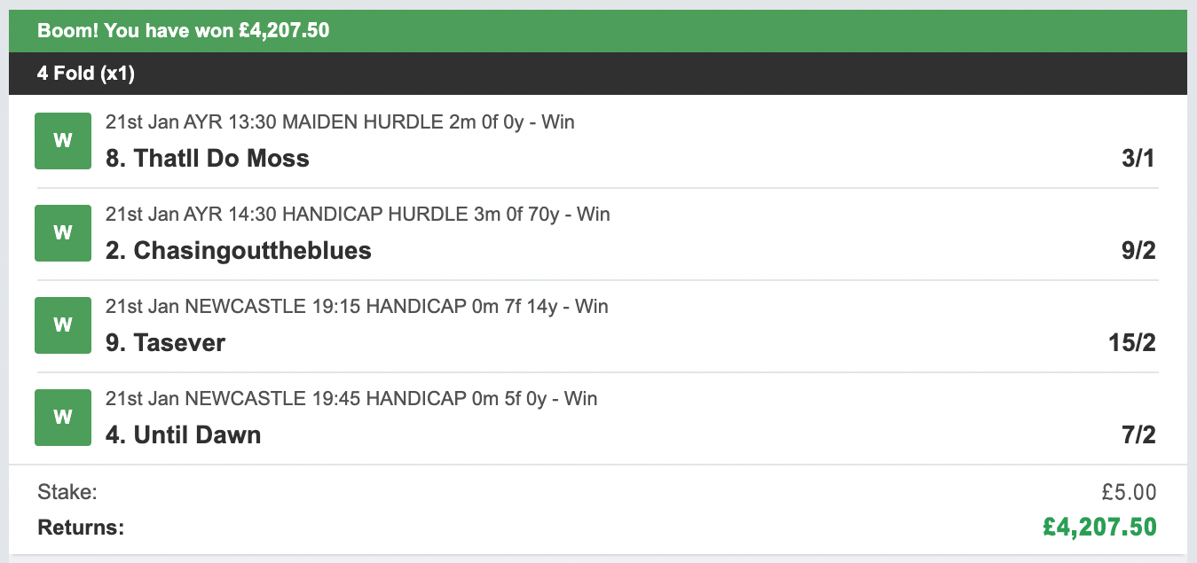 So that's what I did! Each day our bet is made up of just four horses using a 4 fold ACCA bet.